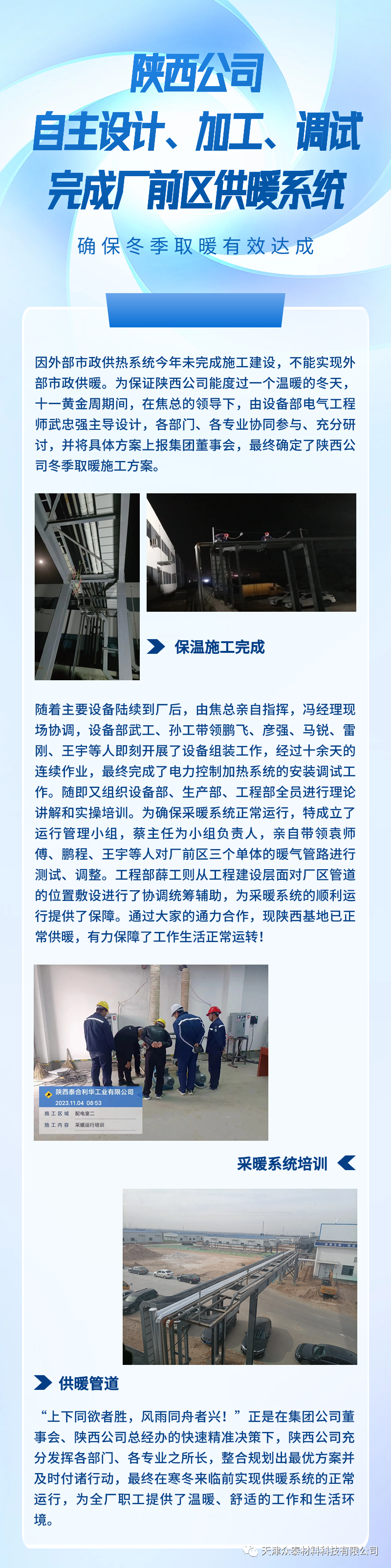 為保證陜西公司能度過(guò)一個(gè)溫暖冬天,十一黃金周期間,在陜西公司焦總的帶領(lǐng)下,由設(shè)備部電氣工程師武忠強(qiáng)主導(dǎo)設(shè)計(jì),各部門(mén)、各專(zhuān)業(yè)協(xié)同參與、充分研討,最終確定了陜西公司冬季取暖施工方案。通過(guò)大家通力合作,現(xiàn)陜西基地已正常供暖,有力保障了工作生活正常運(yùn)轉(zhuǎn)!